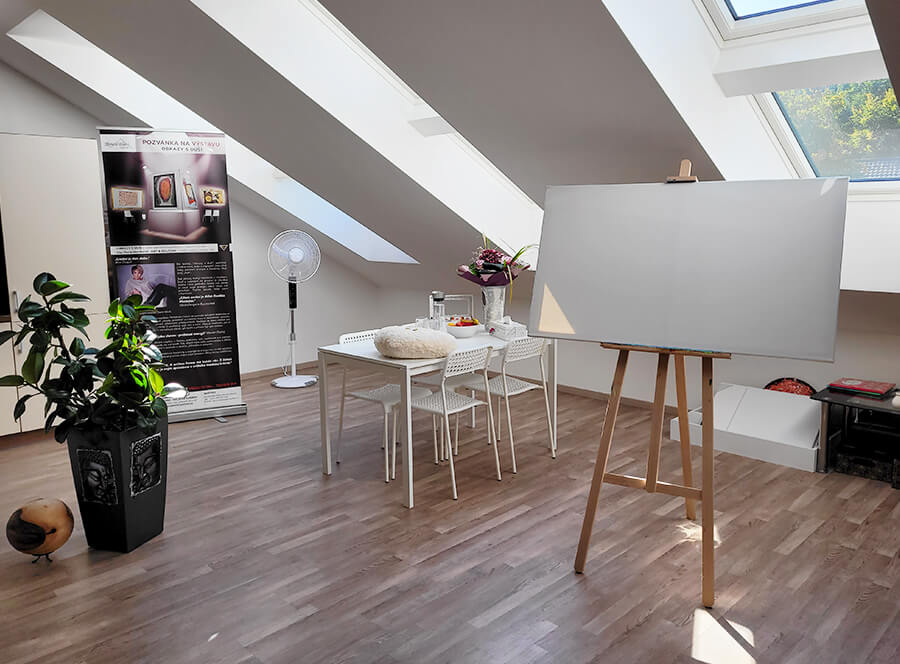 - velký ateliérový malířský stojan, štětce, … vše k tvorbě bude k dispozici po celý čas