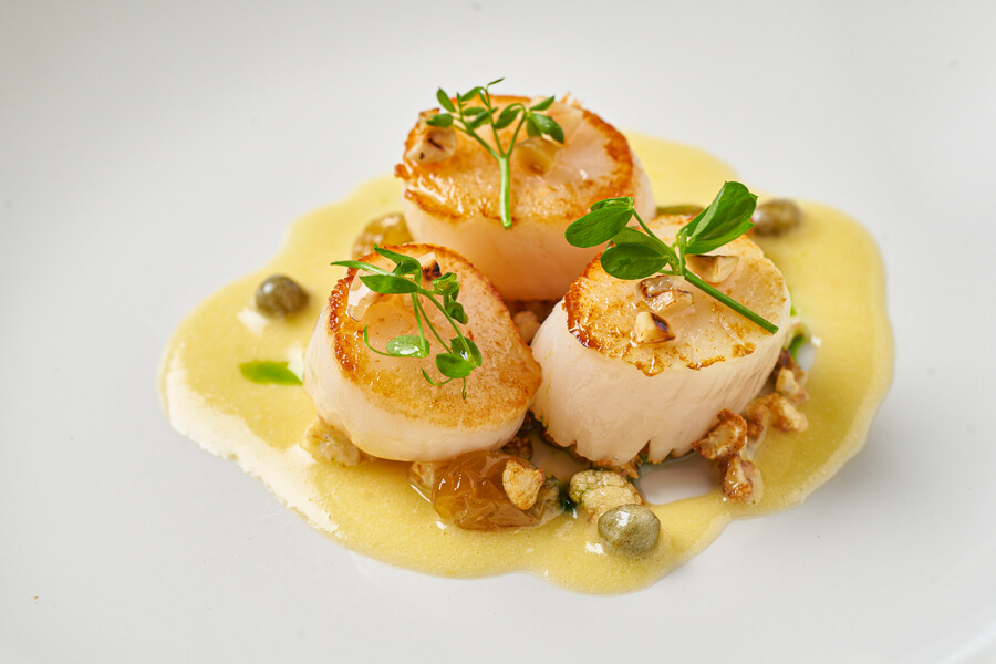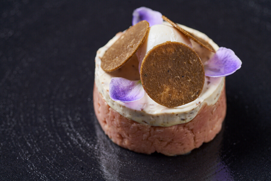 - Halibut pošírovaný v olivovém oleji s černými lanýži, celerovým pyré, slaninou pancetta a zeleninovým beurre monte
