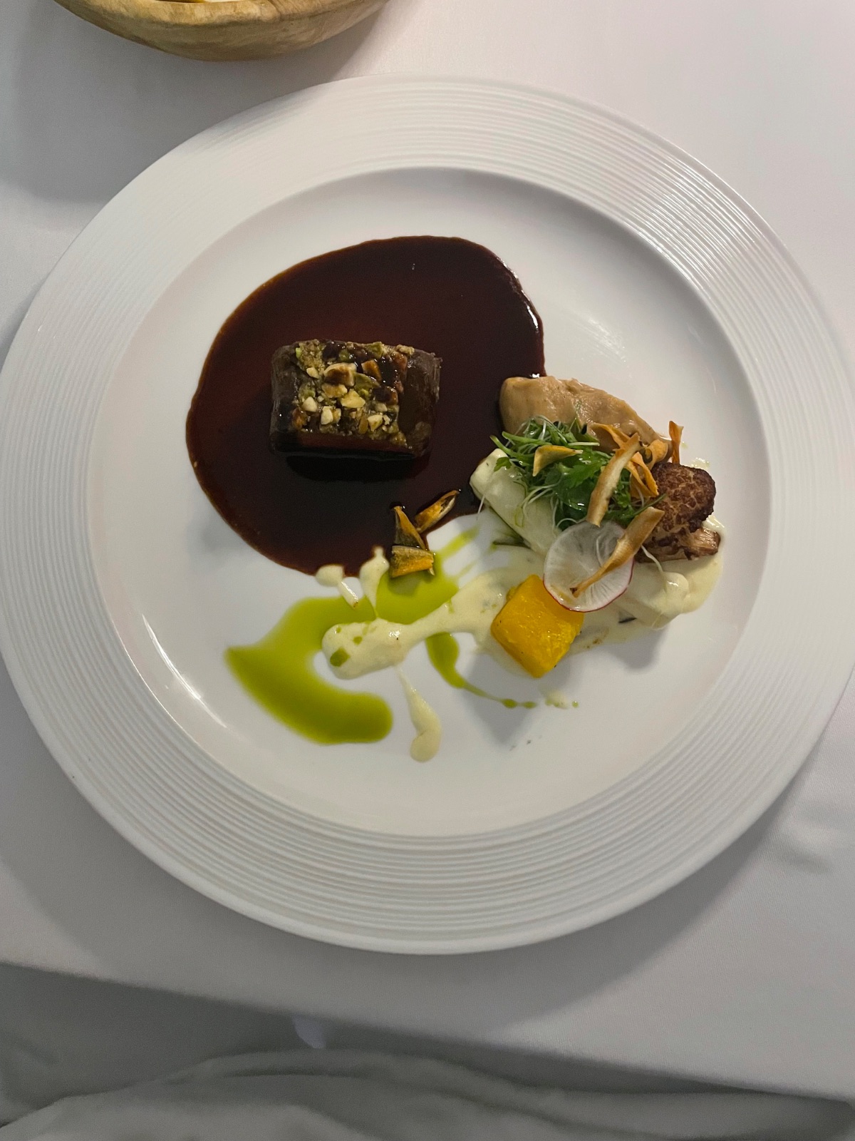 Pochutnat si můžete na: Chřestová polévka s koprovým créme fraiche a sezamovým tuille, Okoun glazírovaný v miso japonské pastě, koláček z hnědé rýže, řeřicha, Zámecké „Kuře na paprice“ s morkovými knedlíky a coulis z uzené červené papriky, Listový salát s čerstvými bylinkami, karotkou, červenou řepou a semifredem z modrého sýra, zálivka ze sektu, Jehněčí roláda s houbami a šalvějí, ratatouille , šťouchané brambory s česnekem, Mrkvový koláč s mrkvovo - zázvorovým želé a sorbetem ze smetanového sýra, hnědé máslo. Uvedené menu se může měnit v závislosti na sezóně.