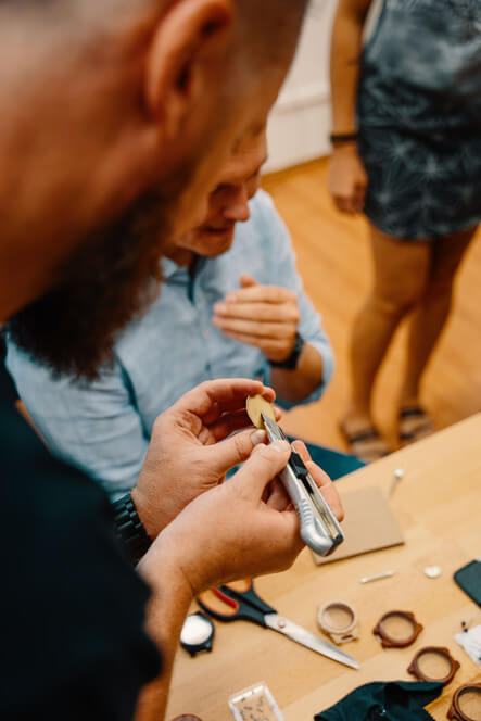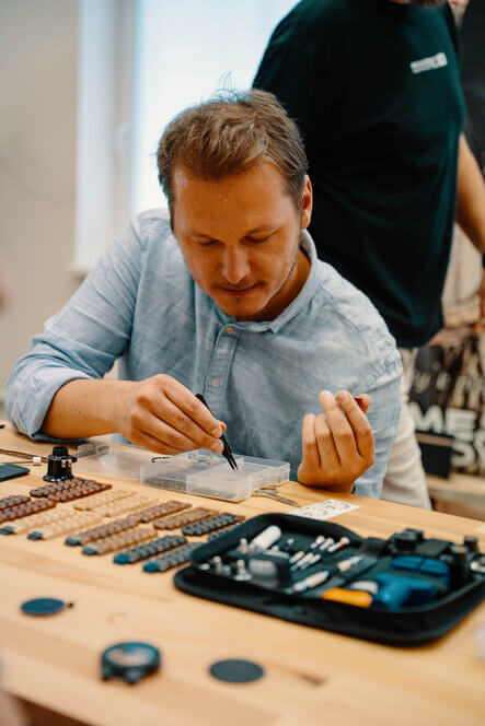 Dopředu si zarezervujte termín workshopu. Na místě už budou připravené veškeré komponenty, nástroje i občerstvení. Pod vedením zakladatele Martina si pak krok za krokem sestavíte vytoužené hodinky.