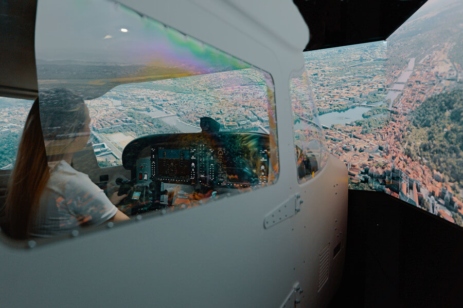 Zavřete oči a představte si, že usedáte do kokpitu Cessny 172. Před vámi trojice obřích OLED obrazovek s celkovým rozlišením 12K a záběrem 180 stupňů kolem kokpitu. Okolo vás dokonalá kopie skutečného letounu a pod rukama citlivé berany reagující na každý váš pohyb. To není sen – to je simulátor nové generace s nejmodernější vizualizací v ČR. Zahrnuje celý svět včetně detailů na úrovni skutečných ulic, domů a mostů.