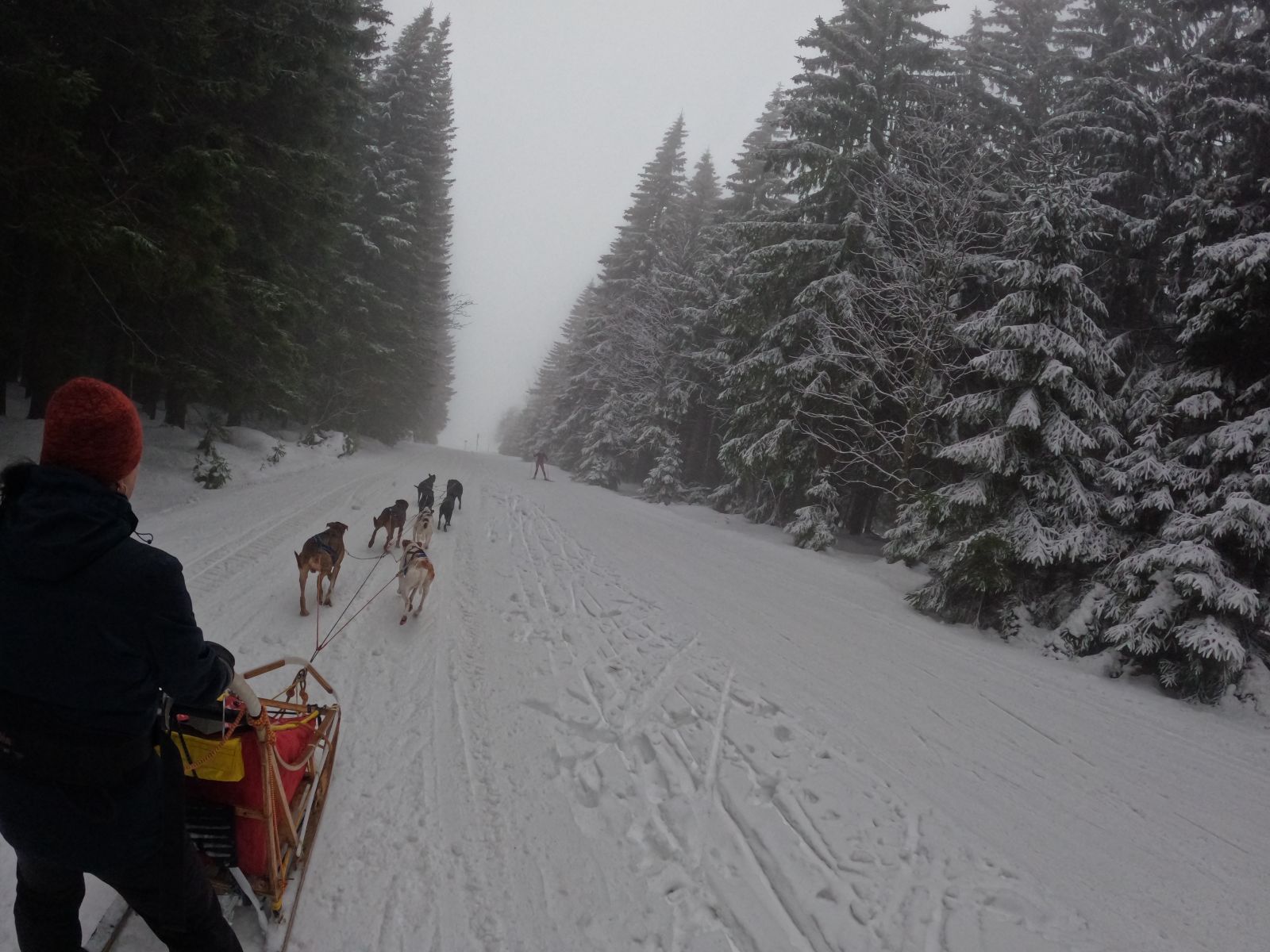 - praktickou část: hodinu a čtvrt dlouhá vyjížďka na saních tažených psím spřežením pod Vaším vedením a pod dohledem instruktora
