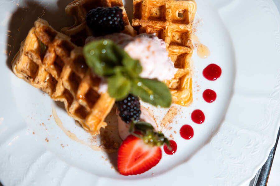 - wafle s malinovým mascarpone, skořicovým cukrem, máta, lesní ovoce,