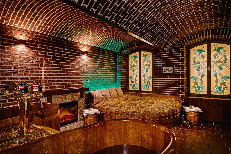 Vyzkoušejte originální lázeňskou proceduru, která je založena na použití výhradně přírodních surovin, materiálů a staročeských léčitelských postupů. PIVNÍ LÁZEŇ – probíhá v ručně vyrobených, tisíci litrových, vířivých kádích z Dubu Královského „Royal Oak“ a je založena na koupeli v přírodních extraktech, z kterých se vaří české pivo Krušovice® – vybrané odrůdy chmele, pivovarské kvasnice a slad. Vysoký obsah chmelových silic přispívá k celkové vitalizaci a uvolňování kožních pórů. Pivovarské kvasnice pak díky vysokému obsahu vitamínu B a aktivním enzymům působí blahodárně na regeneraci pokožky. Díky této jedinečné kombinaci přírodních ingrediencí a magického působení dubu královského, který byl odjakživa symbolem dlouhověkosti a odolnosti, dochází během koupele k povzbuzení látkové výměny, vyplavení škodlivých látek z těla, uvolnění vnitřního i vnějšího napětí, únavy a stresu, a tím k dokonalému duševnímu i tělesnému odpočinku.