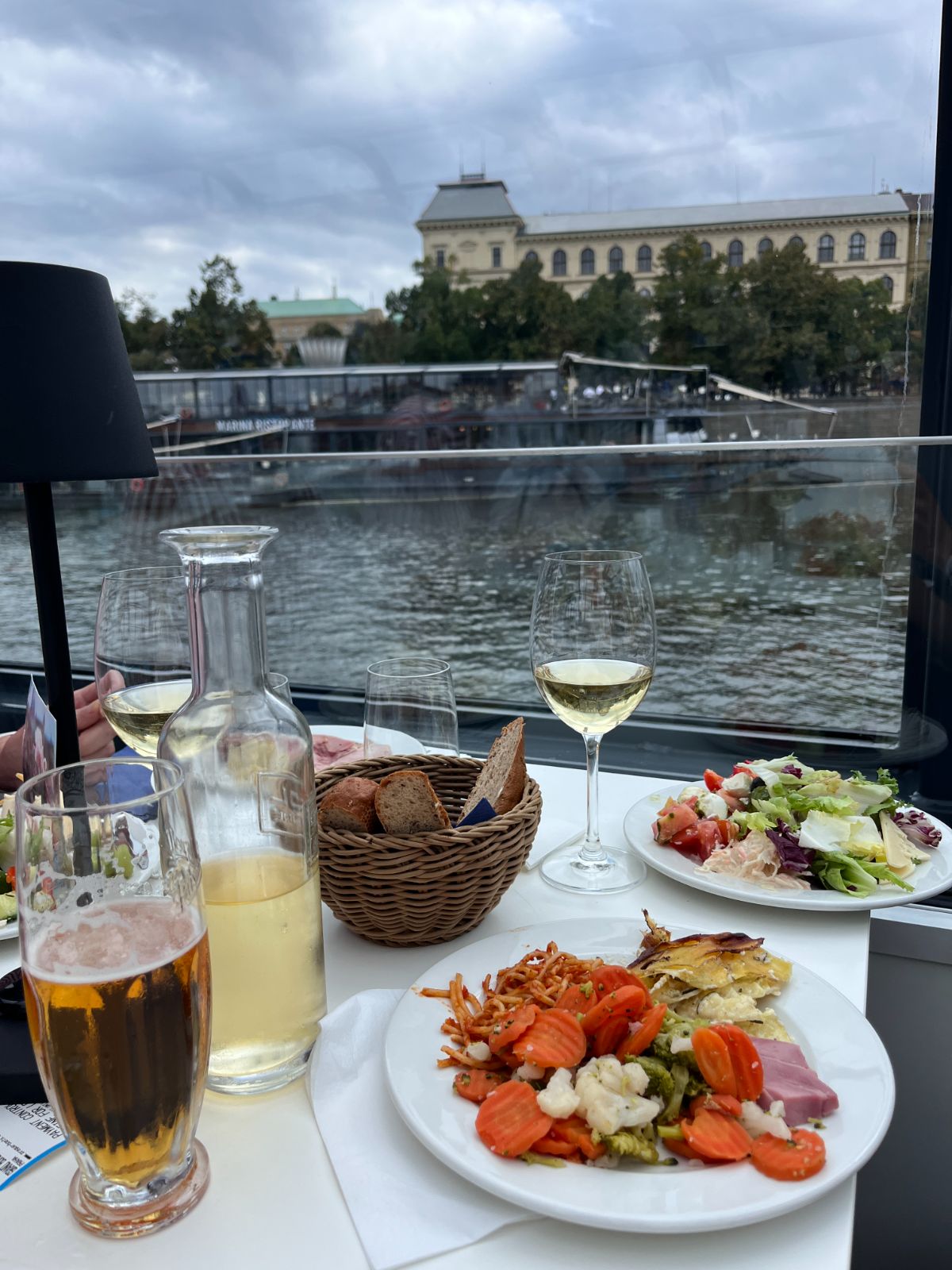 Vítejte na palubě lodi Prague boats! Na uvítanou dostanete typicky český aperitiv a poté může naše 2hodinová plavba s obědem začít! Těšit se můžete na tradiční česká jídla i pokrmy mezinárodní kuchyně. Při plavbě vás kromě živé hudby okouzlí také výhled na nejkrásnější pražské památky. Uvidíte Rudolfinum, Strakovu akademii, poplujete přímo pod Karlovým mostem a uchvátí vás panorama Pražského hradu. Poznáte také, jak fungují zdymadla ve Smíchovské komoře a odkud skákal bájný Šemík v pověsti o Vyšehradu. Tak se připravte, vyplouváme!