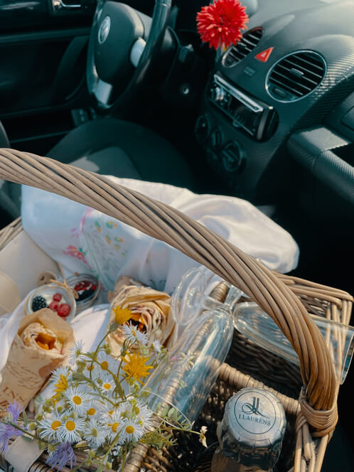 - piknikový koš s dekou (domácí kváskový chléb, prosciutto, rukola, Caesar wrap, variace sýrů, olivy, čerstvé ovoce, dezert ve skleničce, láhev prosecca, láhev domácí limonády)