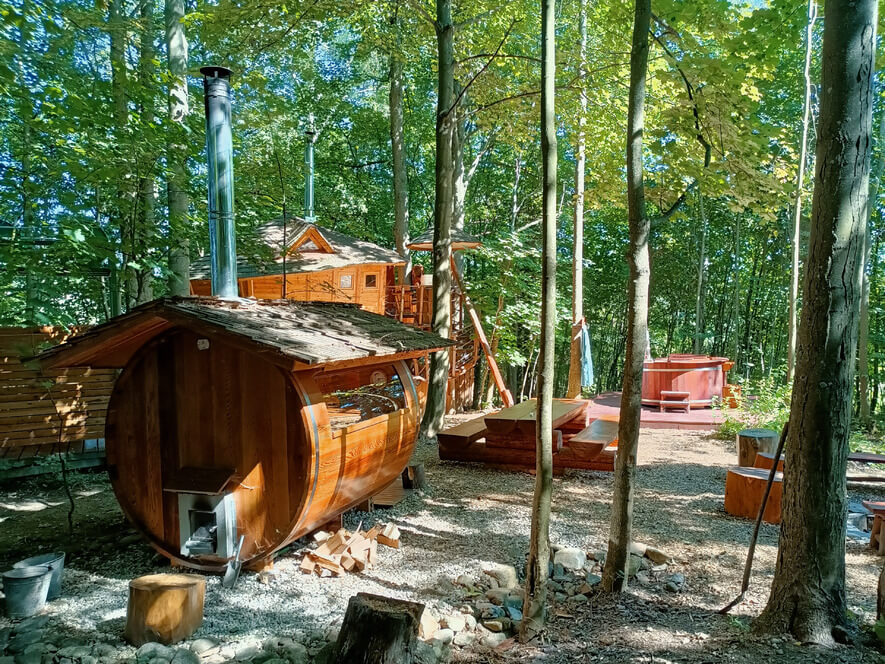 Přijeďte si odpočinout do náruče přírody Dolní Moravy. Zažijte romantiku v korunách stromů, kde můžete strávit příjemný večer při výborném víně. Ubytování v korunách stromů je absolutním návratem k přírodě bez připojení k síti elektrické energie a vody. Chladicí box, nabité lampičky a vařič jsou však k dispozici stejně jako pitná voda. Osprchovat se můžete v přírodní sprše s teplou vodou přímo pod obydlím včetně využití nově vybudované cedrové sauny s teplotou 90 stupňů C. Domeček je vybaven norskými kamínky na dřevo,kdy v zimě garantujeme teplotu pobytu 20 stupňů. Pro děti bude tento zážitek nezapomenutelné dobrodružství. Užijte si společně strávený čas daleko od starostí běžného života.