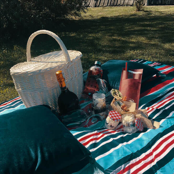 - piknikový koš s dekou (domácí kváskový chléb, prosciutto, rukola, Caesar wrap, variace sýrů, olivy, čerstvé ovoce, dezert ve skleničce, láhev prosecca, láhev domácí limonády)