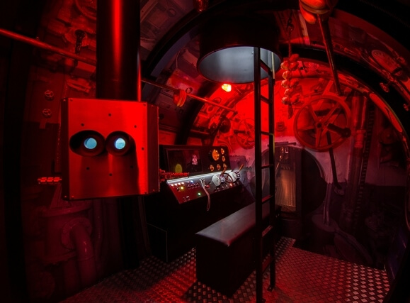 Zjednodušený modul velícího můstku pro tři osoby v rolích (kapitán u periskopu, kormidelník u řízení a zbraňový důstojník u odpalování torpéd). Možnost průsaku vody ze třech vodních okruhů (pláštěnky k dispozici). Instruktor k dispozici, spolupráce všech osob nutná k plnění bojového cíle. Termín lze bez stornopoplatků zrušit 5 pracovních dní před závazně sjednaným termínem.