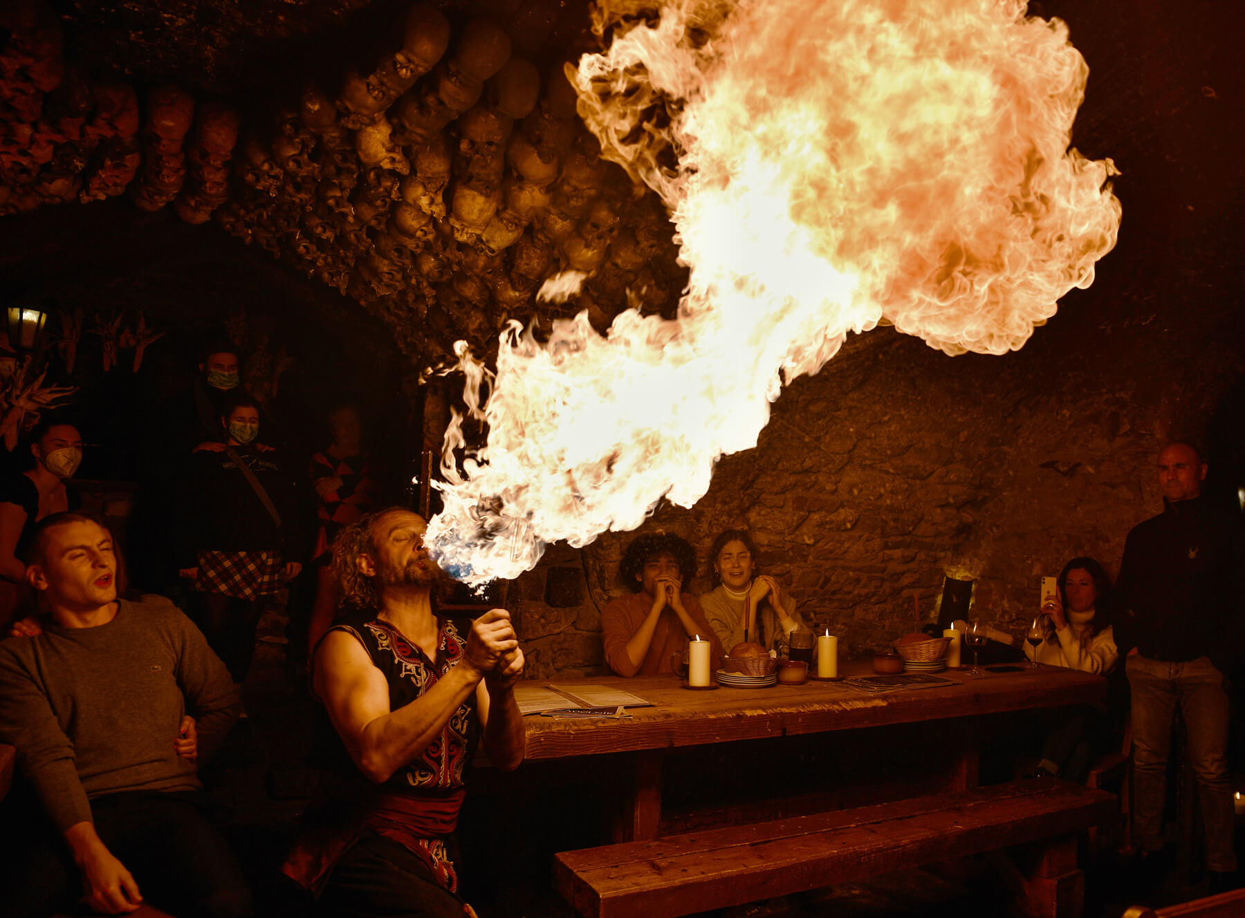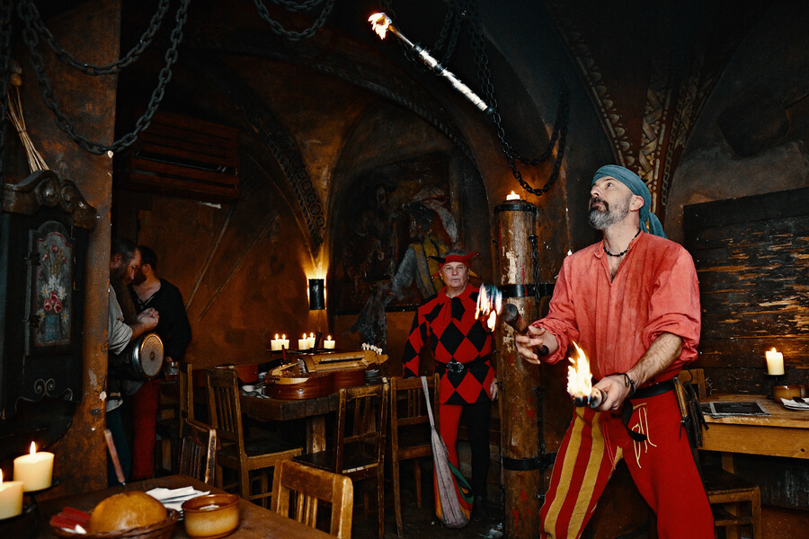 Přijďte a zažijte středověk na vlastní kůži. Vnořte se do světa středověké krčmy U krále Brabantského, kde vás osloví nefalšovaní lapkové, budete svědkem jejich šarvátky šavlemi, loučemi a bambitkami. V jedné z nejstarších hospod v Praze popíjeli rudolfínští alchymisté, kat Mydlář, Mozart, ale i lumpové a podvodníci. Do kola vás vyzve sličná tanečnice za doprovodu živé hudby, budete obdivovat velkého hada dovezeného z dalekých krajů, inkvizitor mezi vámi najde čarodějnici a od ďábla jí očistí. Možná se stanete živým terčem nefalšovaného vrhače nožů a v neposlední řadě vás ohromí velká ohňová show.
