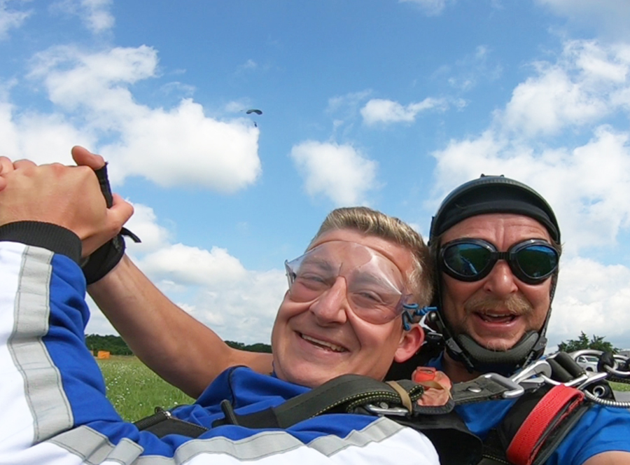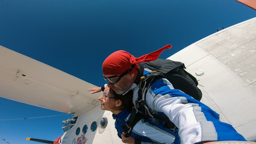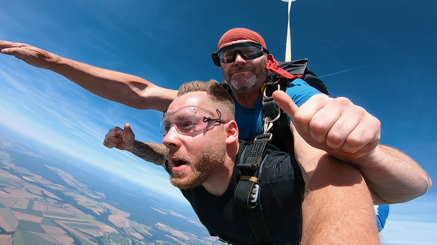 Po příjezdu na letiště, samozřejmě se zástupem podporovatelů, se vydáte do naší ,,kanceláře“ . S trochou obavy a velkou nedočkavostí vyplníte důležité formuláře. To, abychom věděli kdo jste, odkud jste k nám přijeli, jak jste velcí….., ale hlavně, že jste dorazili a mooooc se těšíte :-) Po nezbytných formalitách se převléknete do našeho nebo Vašeho pohodlného oděvu a můžete nasávat atmosféru našeho krásného nového prostředí. Na seskok Vás bude připravovat od samého začátku Váš tandem-pilot. Po startu do výšky 3-4tis. bude následovat asi 20ti minutový vyhlídkový let letadlem s nádherným výhledem na okolní krajinu. Před výskokem si Vás tandem-pilot připoutá, následuje výskok a volný pád asi 40-60sec., který je snad jedinou částí zážitku, který nelze slovy skutečně popsat, ten se musí zažít. Nezažiješ, nepochopíš ;-). Po otevření padáku jej budete moci sami řídit až téměř do přistání. To je zpravidla hladké a završí Váš zážitek z tandemového seskoku. Během celého zážitku bude tandem pilot pořizovat záznam na kameru, aby byl uchován právě ten moment, který nelze popsat slovy. Po přistání Vám bude umožněno podívat se na obrazovce v zázemí, jak Vám to slušelo a Vy se můžete stále ještě rozhodnout pro zhotovení videa či fotek, kterým/i se hned druhý den můžete chlubit přátelům, známým, rodině…