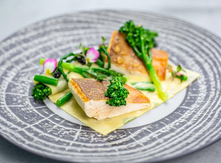 Filet candáta s pyré z pečené cibule, máslovou kapustou, marinovanými cibulkami, praženými lískovými oříšky a zálivkou se zázvoru, citronu a medu.