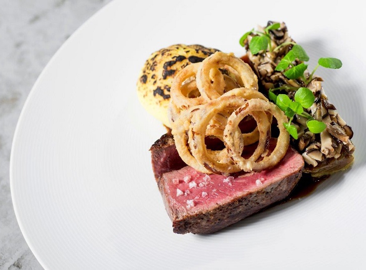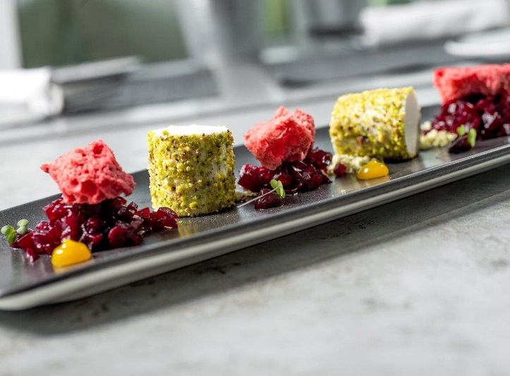 Kachní prso s petrželovým pyré, pečeným celerem, nakládaným rakytníkem, slámou ze smaženého pórku a demi glace. - DEZERT: Jahodový mousse v ruby čokoládě s rebarborou, meduňkovým gelem a pistáciovým spongem